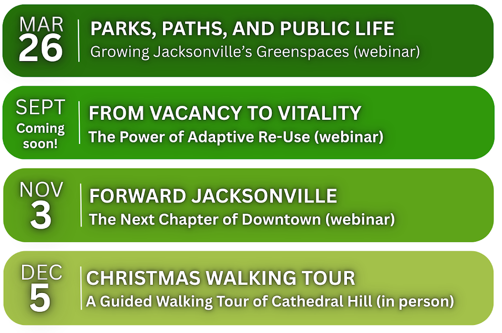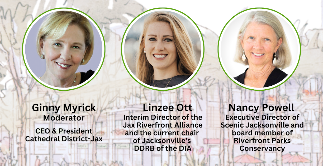 Explore how parks, trails, and riverfront spaces are shaping a more vibrant, connected city in Jacksonville. Hear from Linzee Ott of Jax Riverfront Alliance and Nancy Powell of Scenic Jacksonville (and board member of Riverfront Parks Conservancy) as they discuss growing Jacksonville’s greenspaces. This free Zoom event on Thursday, March 26 at 4pm launches the Community Dialogues on Cathedral Hill series by Cathedral District-Jax, Inc.